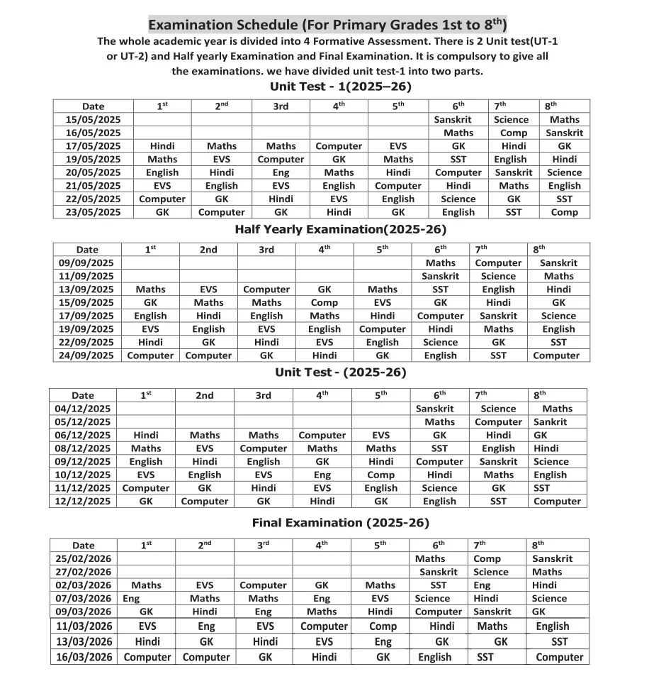 Examination Schedule for First to Eight