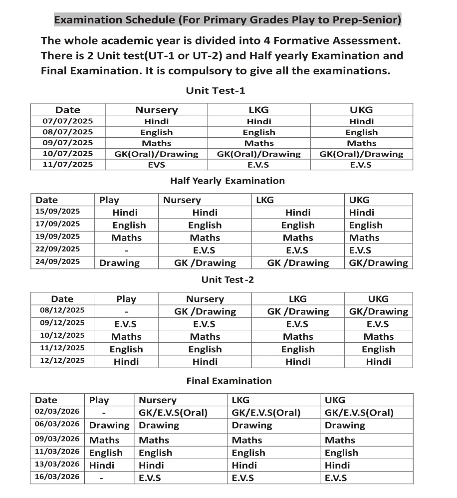 Examination Schedule for Play to Prep-Senior